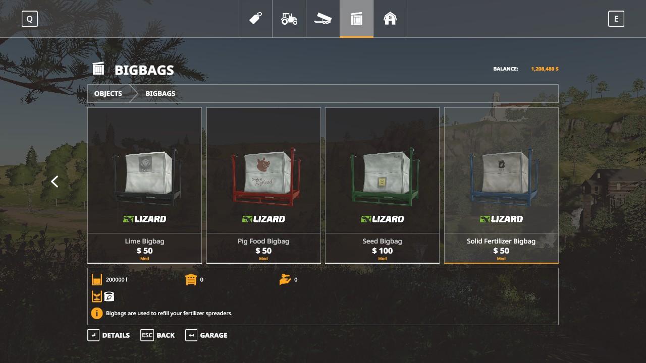 These are some of the Big Bags and Tank Pallets most used my players. I have increased the capacity and lowered the price on all of them. Pack includes the seed big bag; 200000l and $100, solid fertilizer big bag; 200000l and $50. pig food big bag; 500000l and $50. spalings pallet; 100 spalings and $100, lime big bag; 200000l and $50, herbicide tank; 400000l and $500, and the liquid fertilizer tank; 100000l and $500. Please do not post on any other site without permission.