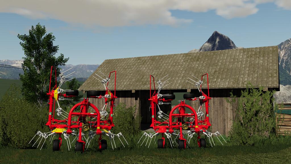 The Pöttinger HIT 47 N is a 4 rotor tedder with 6 arms and hydraulic lifting and turning for the outer rotors for a secure and space saving transportation.