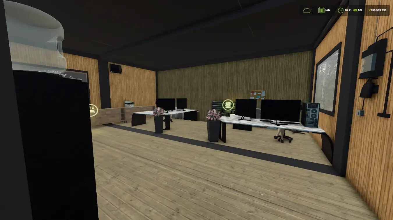 - Hall 3 Hall with office extension for contractors or miscellaneous Price €95,000 5 gates 2 doors left right An office building is attached to the right with office furniture a TV that you can turn on and off The trigger for this goes behind the TV and then the trigger should pop up in the office building the light in front of the desk by the door is switched on and the light in the hall in the hall a solar system can be selected or not textures have been completely changed in contrast to the LS22 mod. Maintenance is €40