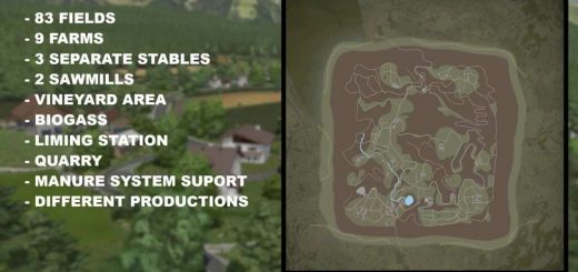 A fictional Irish map based in the West of Ireland with 255 fields, mainly grassland with some arable fields. There are 12 farm yards to choose from plus an additioanl Contractors yard at the BGA.