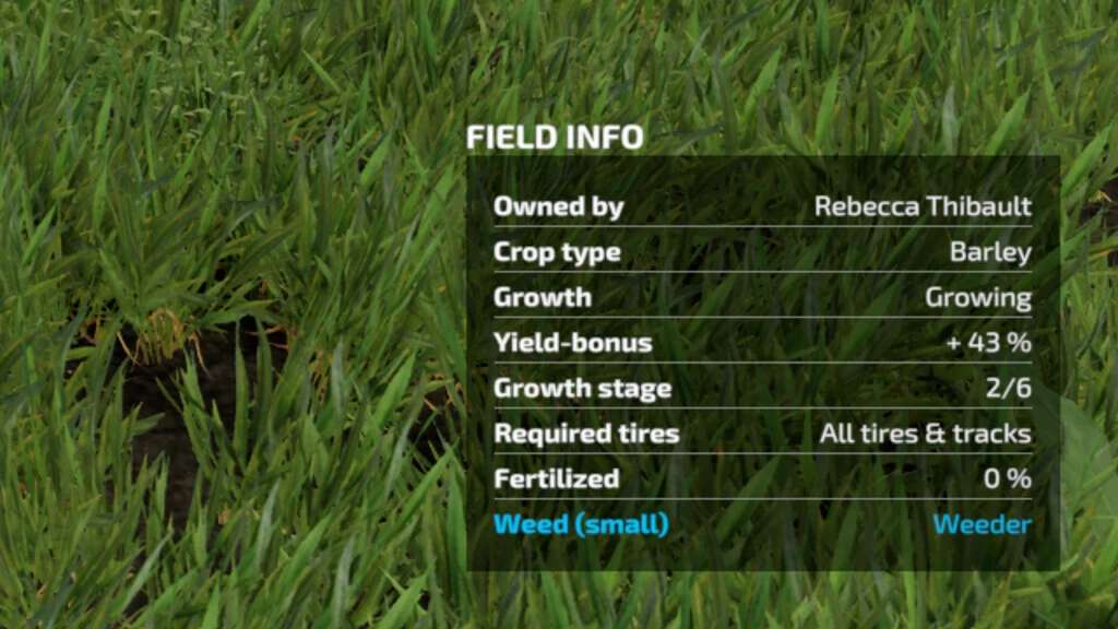 Displays the crop’s exact growth stage in the field info panel, next to the total amount of growth stages before the crop is harvestable.