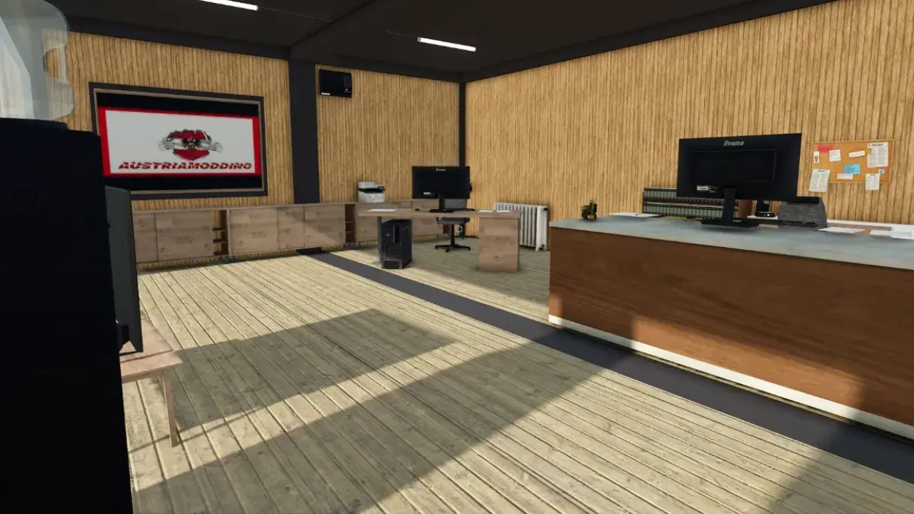• Hall 3 Hall With office extension for contractors or miscellaneous Price 95000€ 5 gates 2 doors left right On the right there is an office building with office furniture a TV that you can switch on and off Trigger for it go behind TV and then the trigger should pop up in the office building it will The light in front of the desk by the door is switched on and the light in the hall in the hall a solar system can be selected or none