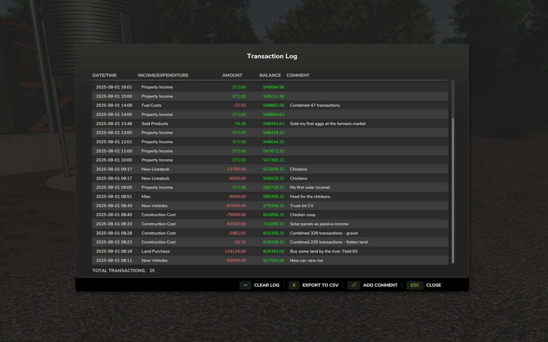 Transaction Details: Display in-game date/time, transaction type, amount, and current farm balance